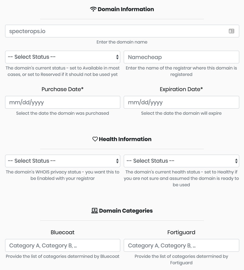 To add just one domain name to the library, click the Domain Library tab on the menu bar and Add New Domain. This opens the domain form for documenting and submitting a single domain name.You may not know the latest health information for the domain. You can set the domain to Healthy as a default value and leave categories blank.