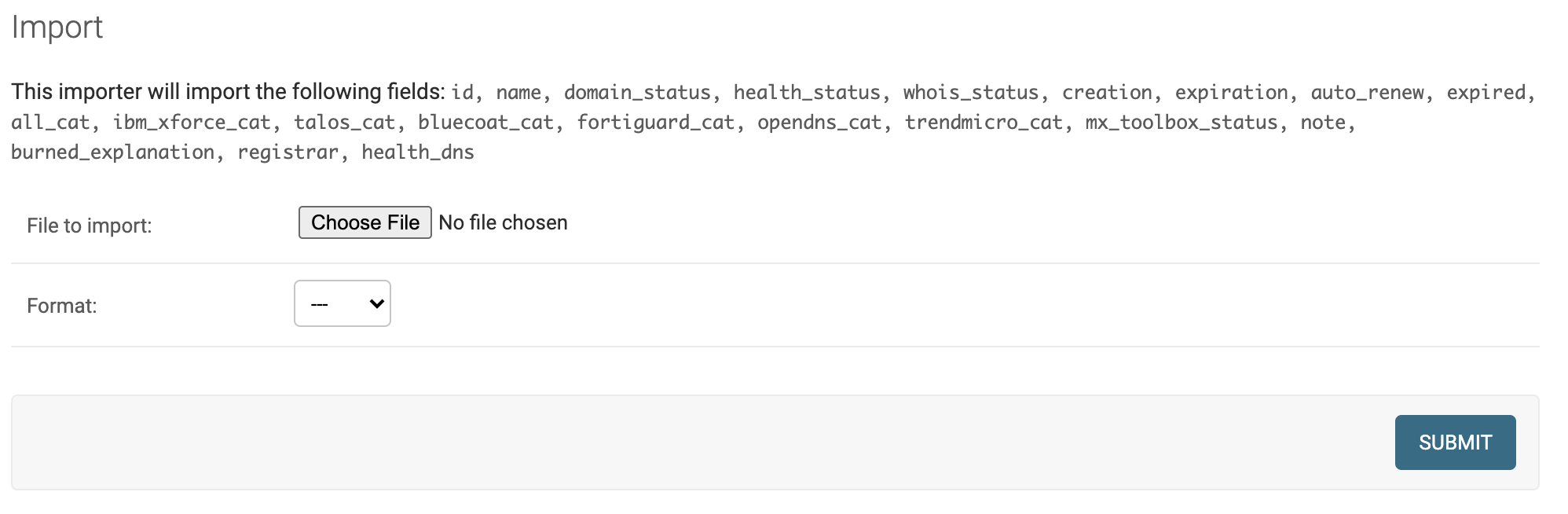 To add just one domain name to the library, click the Domains tab on the menu bar and Add New Domain. This opens the domain form for documenting and submitting a single domain name.You may not know the latest health information for the domain. You can set the domain to Healthy as a default value and leave categories blank.
